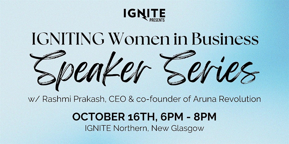 Join us Oct 16 in New Glasgow for an inspiring talk with Rashmi Prakash, CEO of Aruna Revolution. Refreshments provided! Date and time Thursday, October 16 · 6 - 8pm ADT Location IGNITE Atlantic - New Glasgow 345 Temperance Street New Glasgow, NS B2H 3P7 About this event Business • Startups Date & Time: October 16th | 6:00 PM – 8:00 PM Location: IGNITE New Glasgow Refreshments provided Description: Join us for an inspiring evening as part of the IGNITING Women in Business Speaker Series, featuring Rashmi Prakash, CEO and Co-Founder of Aruna Revolution. Rashmi is a visionary entrepreneur who is transforming menstrual health through sustainability and innovation. With a background in electrical and biomedical engineering, she co-founded Aruna Revolution to tackle the environmental impact of traditional menstrual products by creating compostable pads made from natural plant fibers and agricultural by-products. In just three years, Rashmi has guided Aruna from concept to award-winning success—securing investment on Dragons’ Den and winning the $100,000 Impact Investment Prize at Startupfest 2025. Her mission is clear: to build a future where healthcare solutions not only reduce environmental harm but also promote equity and accessibility for all. Why Attend: Gain insights from Rashmi’s entrepreneurial journey in launching a purpose-driven startup. Learn how intellectual […]