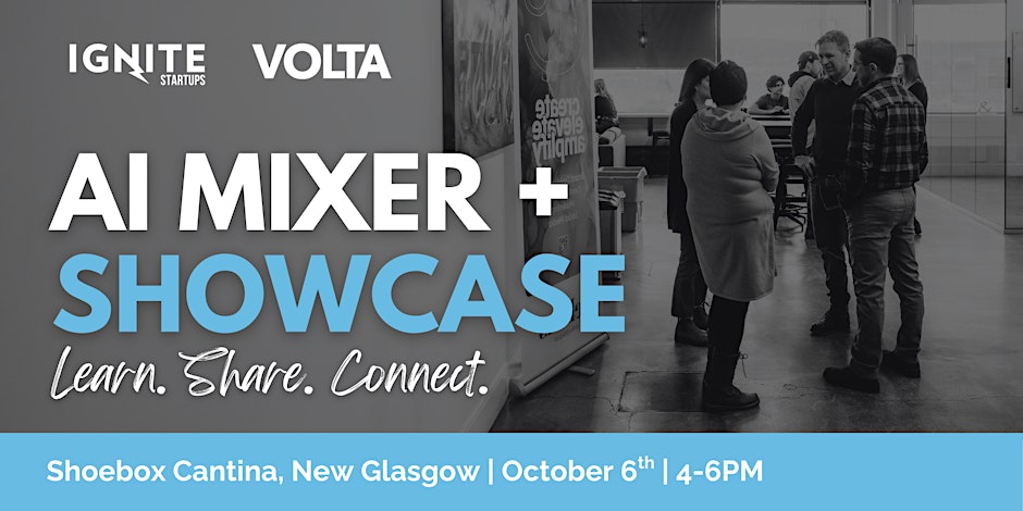 Join Volta & IGNITE in New Glasgow for a panel showcase and community mixer exploring AI’s local impact. Date and time Monday, October 6 · 4 - 6pm ADT Location Shoebox Cantina 84 Provost Street New Glasgow, NS B2H 2P4 Good to know Highlights 2 hours In person About this event Science & Tech • High Tech Discover AI. Connect with Innovators. Build the Future—Together. Artificial Intelligence is shaping industries across Nova Scotia—and New Glasgow is part of that story. Join Volta and IGNITE for an AI Mixer + Showcase, bringing together local innovators, entrepreneurs, and curious minds for an afternoon and evening of learning and connection. What to Expect: ✔ Panel Showcase – Hear how AI is being applied locally, explore emerging tools, and connect with the Yarmouth innovation community. ✔ Mixer & Networking Opportunities – Meet peers who are curious about, or already working with, AI. 📅 Date: Monday, October 6th 🕓 Time: 4:00 PM – 6:00 PM 📍 Location: Shoebox Cantina Whether you’re experimenting with AI in your business, curious about the possibilities, or looking for local connections, this event is for you.