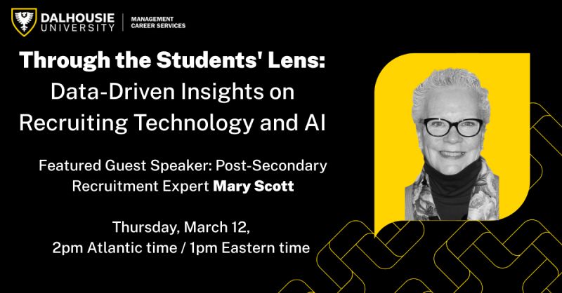 OnlineThe Faculty of Management at Dalhousie University is proud to provide this free learning opportunity to current and soon to be employer partners. Join consultant Mary Scott of the Scott Resource Group in a data-driven exploration of how students assess employers’ current use of technology throughout the recruiting process. Access unbiased research that explores candidates’ attitudes, preferences, and experiences with recruiting platforms and tools. And, discover the impact of artificial intelligence (AI) through the student’s lens during their job search. Expect findings – mapped to unfiltered data – you won’t hear elsewhere!